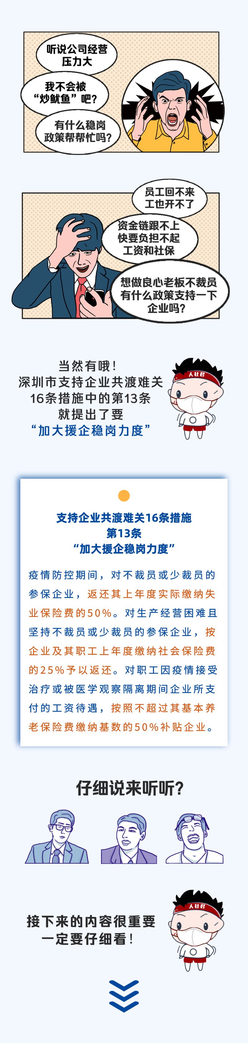 《市政府支持企业共渡难关16条措施》(深府规〔2020〕1号),第13条“加大援企稳岗力度”包括了失业保险稳岗返还和援企稳岗补贴两项政策。