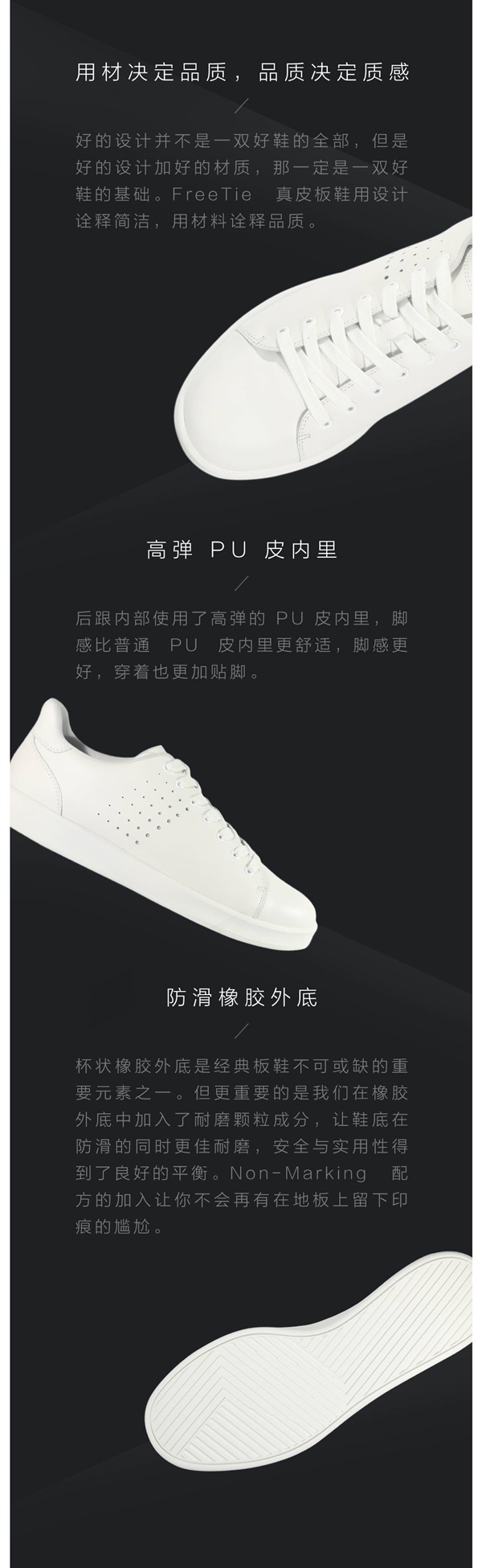 Free Tie板鞋采用全进口加厚头层NAPPA牛皮,质感柔软透气,130道工序完全纯手工制作。杯状橡胶外底,加入了耐磨颗粒,Non-Marking配方,也不会在地板上留下印痕。后跟内部采用高弹PU皮内里,比普通PU皮内里更舒适,穿着更加贴脚。