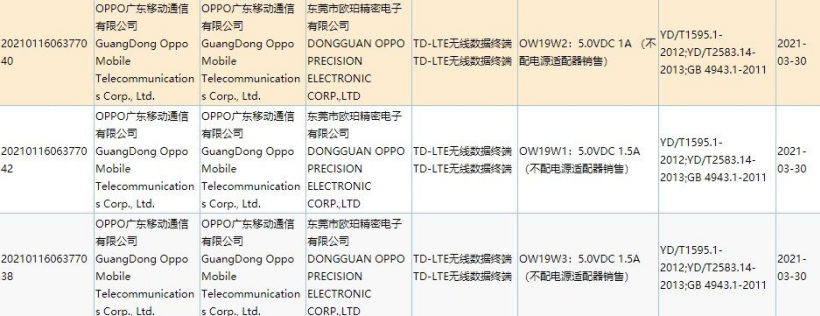 IT之家了解到,今年 4 月份,有多款 OPPO 设备通过 3C 认证,支持 4G 网络,充电速率为 5V 1A 或 5V 1.5A,均不配电源适配器销售。
