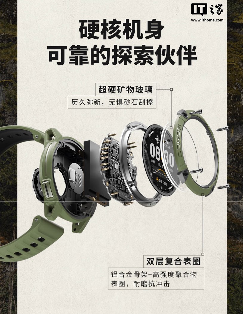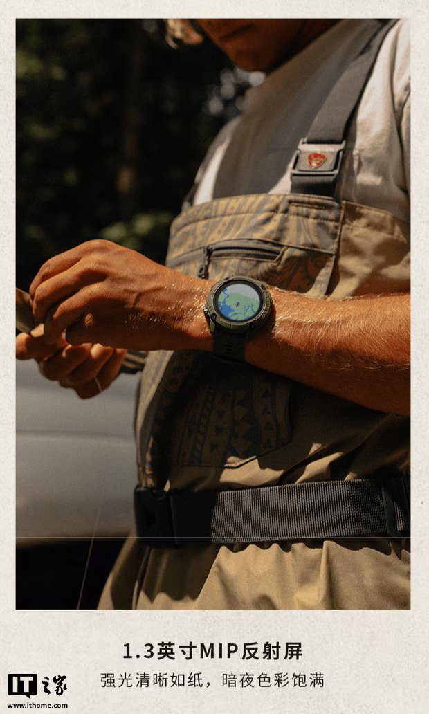 据介绍,这款手表匹配 1.3 英寸 MIP 反射屏,外覆莫氏硬度 9 级矿物玻璃表镜和铝合金骨架 + 高强度聚合物表圈,提供 50 米防水等级。