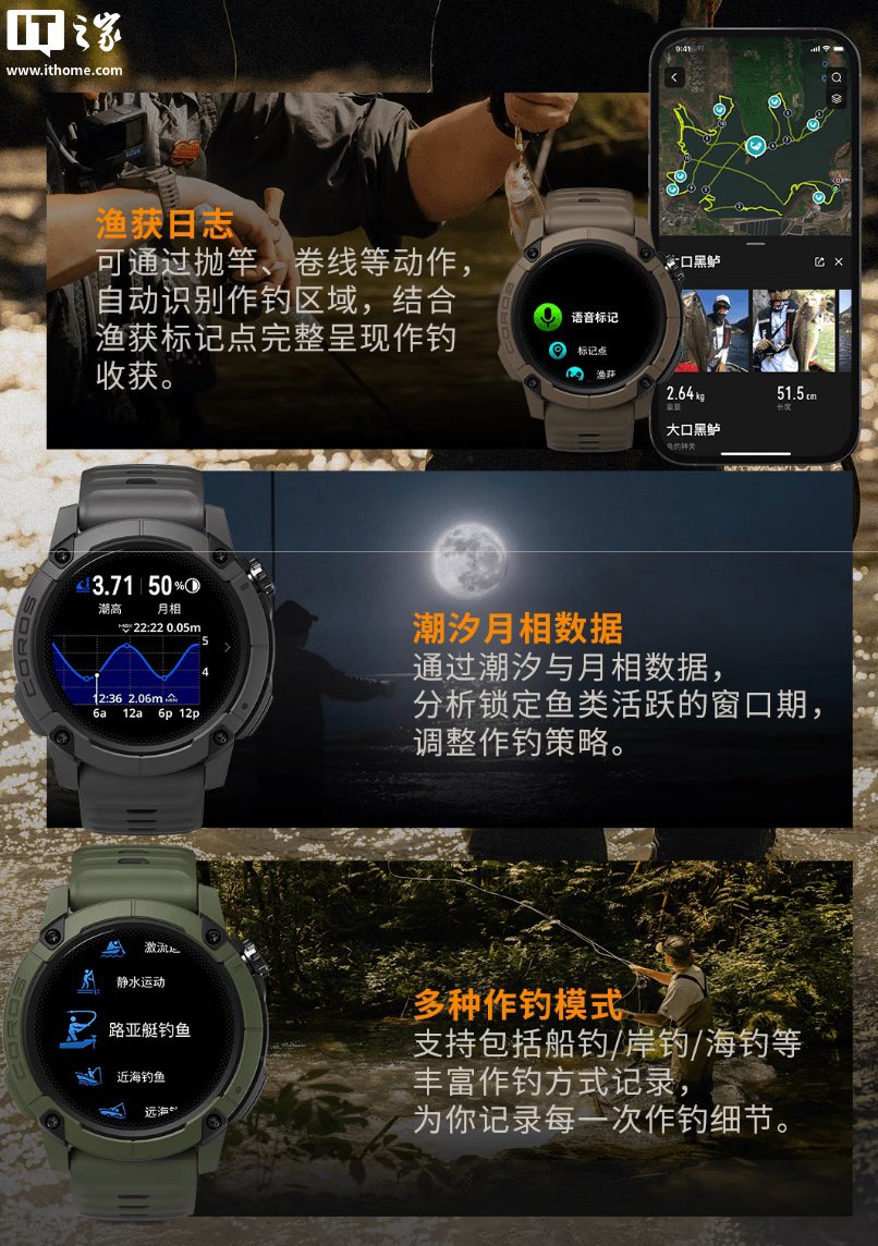 其他方面,IT之家获悉该手表提供运动相机远程控制功能,内置多种运动检测,同时支持测量血氧心率,手表内置钓鱼模式,提供渔获日志、潮汐月相数据等功能。