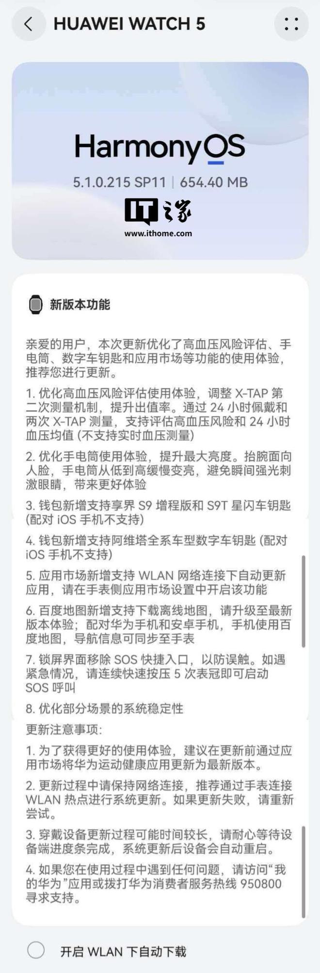 9 月 29 日消息,华为 WATCH 5 智能手表现开启鸿蒙 HarmonyOS 5.1.0.215 SP11 版本升级,系统包大小约 654.40 MB。据介绍,本次更新优化了高血压风险评估、手电筒、数字车钥匙和应用市场等功能的使用体验。