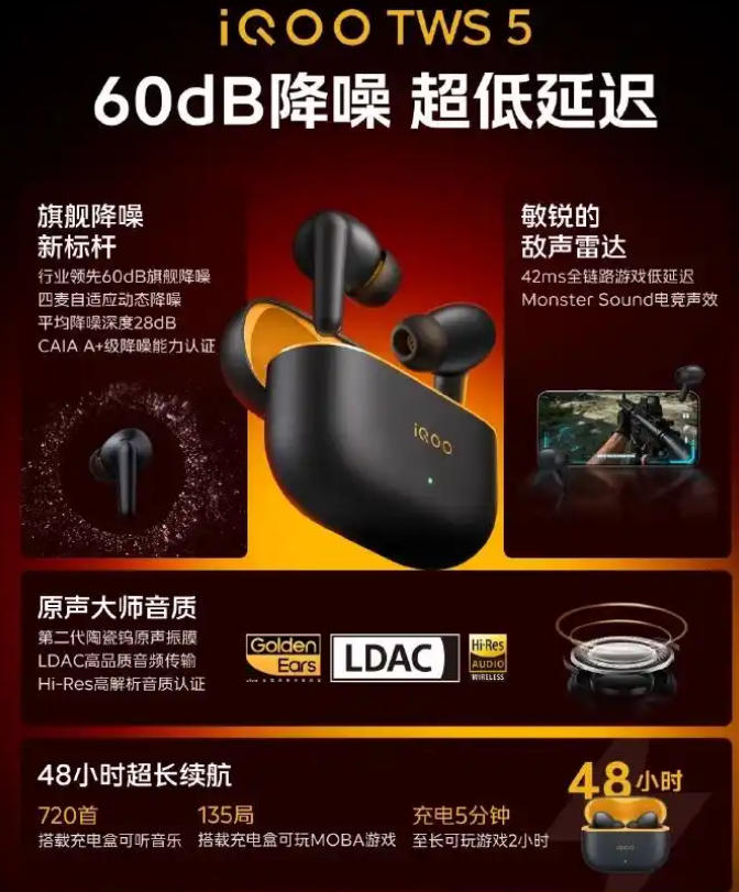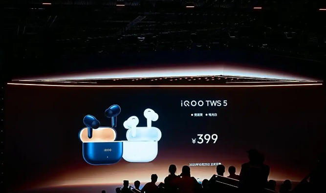 iQOO TWS 5 耳机于 10 月 20 日晚发布,今日正式开售,价格为 399 元(国补价 359.1 元),提供竞速黄、电光白配色。