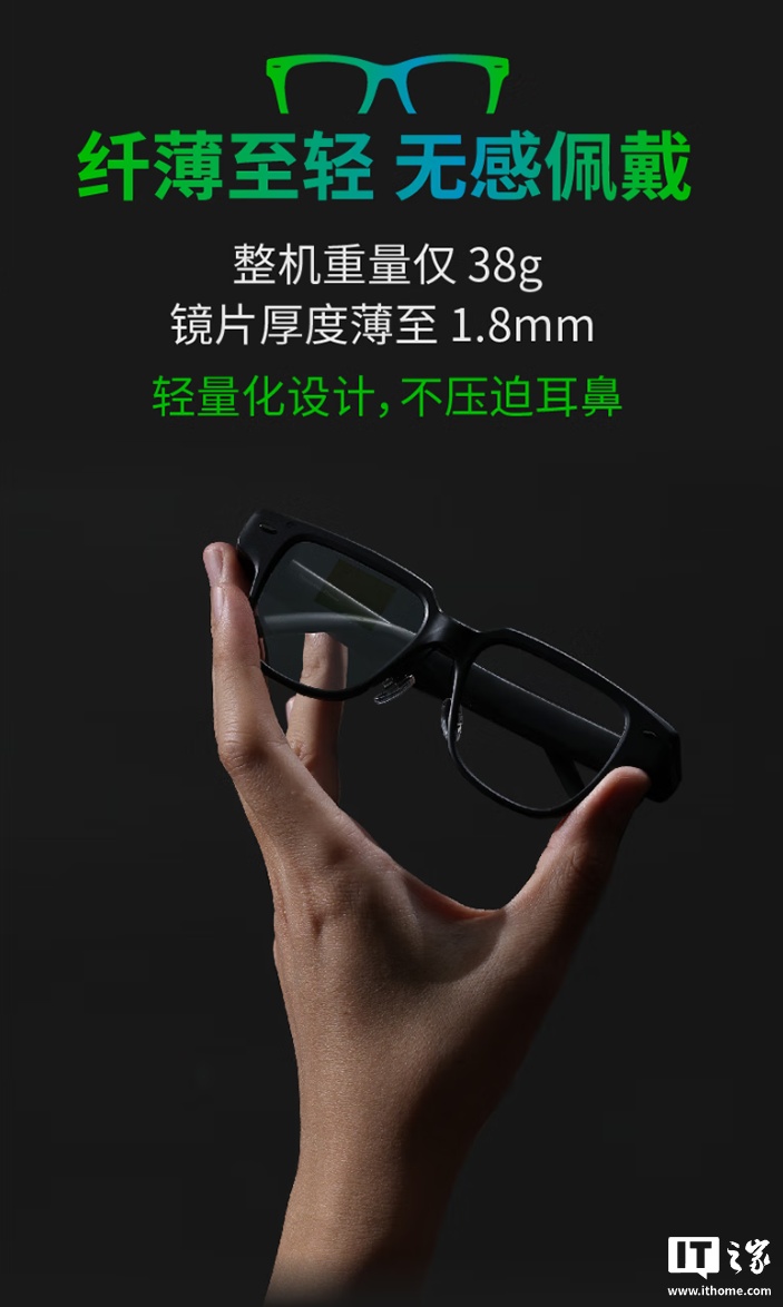 这款眼镜采用轻量化设计,整机重量 38 克,镜片厚度薄至 1.8mm,号称“不压迫耳鼻”,内置树脂衍射光波导技术屏幕,亮度可达 2000 尼特,眼动观看范围(Eye box)是 15*11mm,可在行走中带来更稳定的使用体验。