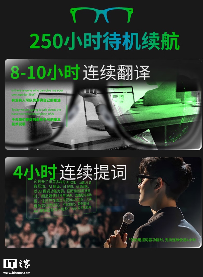 软件方面,这款眼镜搭载天禧智能体,可通过语音进行 AI 互动,拥有日程提醒、消息提醒等功能,可按需求调整单目、双目显示,待机续航可达 250 小时,可连续翻译 8-10 小时。