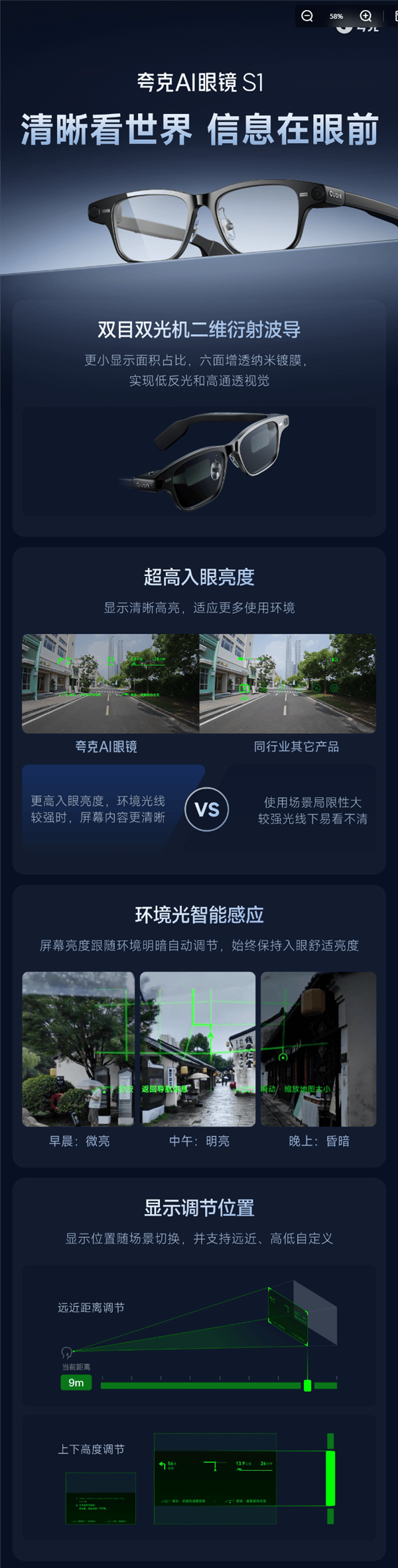 据悉,夸克AI眼镜S1采用双目双光机二维衍射波导方案,通过六面增透纳米镀膜实现低反光、高通透视觉效果,超高入眼亮度可适配强光环境,对比同行业产品显示更清晰。