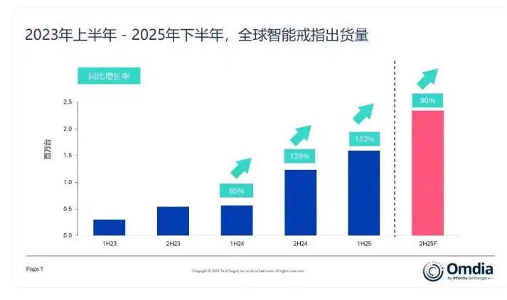 11 月 25 日消息,研究机构 Omdia 今日发布报告,全球智能戒指市场近年来迅速升温,2025 年正成为其最强劲的一年。Omdia 数据显示,2023 年智能戒指出货量已超过 85 万台,2024 年超过两倍增长至 180 万台,而 2025 年上半年已达到 160 万台。全年出货量预计将突破 400 万台,突显出该品类在更广泛的可穿戴生态系统中的迅猛崛起。