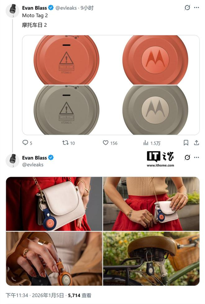 泄露图还展示了第二代智能追踪器 Moto Tag 2。该产品延续了前代类似纽扣的设计,保留了与苹果 AirTag 配件的兼容性,并新增了鼠尾草绿和焦橙色两种配色。