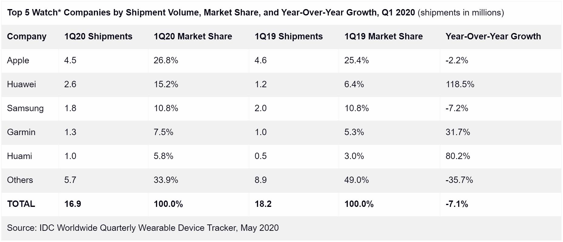 数据显示,2020年第一季度智能穿戴设备市场,苹果出货量依然占据榜首,总计出货2120万部,同比增长59.9%,市场份额占比29.3%;小米排名第二,出货量为1010万部,同比增长56.4%,市场份额占比14.0%;三星出货量为860万部,同比增长71.7%,市场份额占比11.9%;华为出货量为810万部,同比增长62.2%,市场份额占比11.1%。排名前四的厂商共计市场份额占比达66.3%,而去年同期这一数值仅为53.2%。