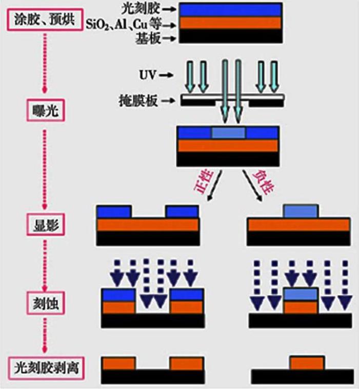 g线、i线主要用于250nm以上工艺;KrF一般用于250nm-130nm工艺;ArF一般用于130nm-14nm,最多可以用于7nm DUV工艺;EUV光刻胶主要用于7nm及以下工艺。