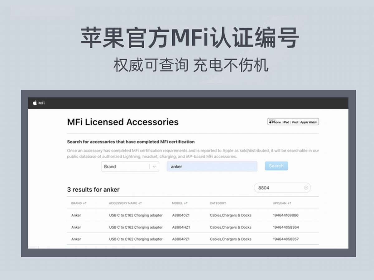 Anker Apple Watch充电器使用苹果官方授权的充电模组,获得苹果官方MFi认证,可通过苹果官网查询认证编号,拥有与苹果原装Apple Watch充电器相同的充电效果,内置多种保护措施,安全稳定快充不损坏设备。