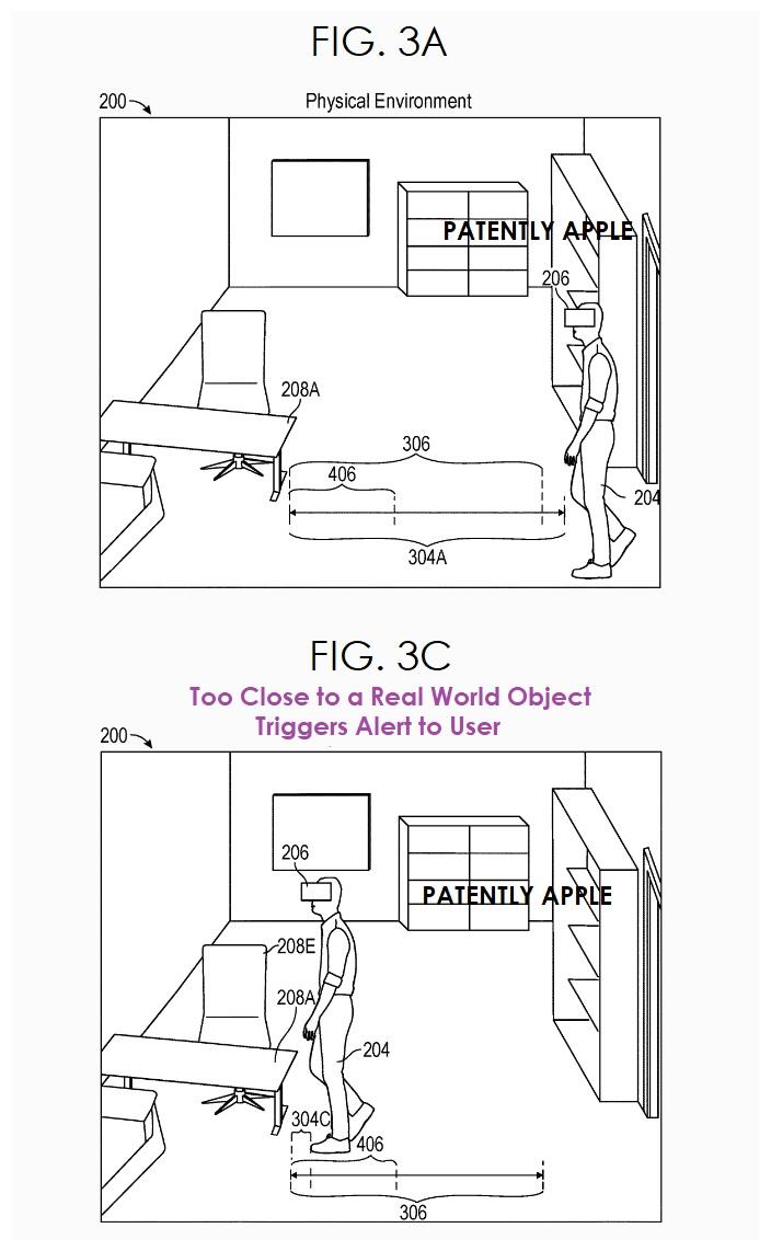 专利图3A描绘了VR玩家与障碍物之间的安全距离,而专利图3C则显示了当VR玩家将与障碍物发生碰撞时,警示系统启动以提醒玩家。