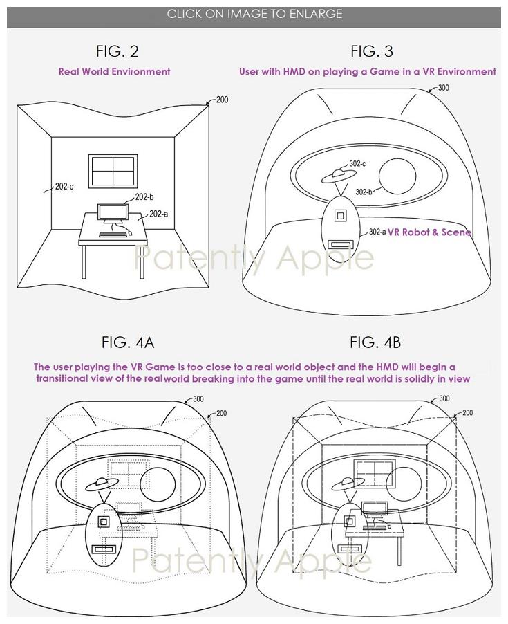 上周四美国专利局公布了另一项主题为“将现实环境中的物体在虚拟环境中显示”的新专利,该专利指出:“在一些典型实例中,在用户碰触障碍物之前提供物体图像以增强用户的安全感”。