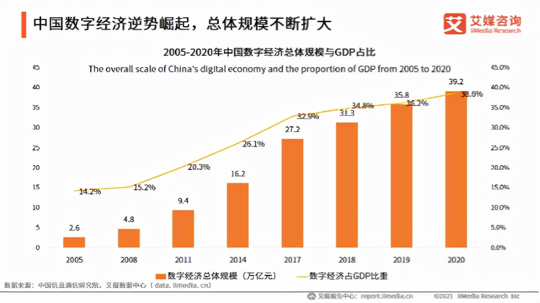 根据艾媒咨询《2021中国数字经济产业发展研究报告》中显示,2020年我国数字经济总体规模达到40万亿元,数字经济占GDP比重接近40%。国家发展改革委高技术司负责人在答记者问时表示,截至目前,我国数据中心规模已达500万标准机架,算力达到130EFLOPS(每秒一万三千亿亿次浮点运算)。随着数字技术向经济社会各领域全面持续渗透,全社会对算力需求仍十分迫切,预计每年仍将以20%以上的速度快速增长。