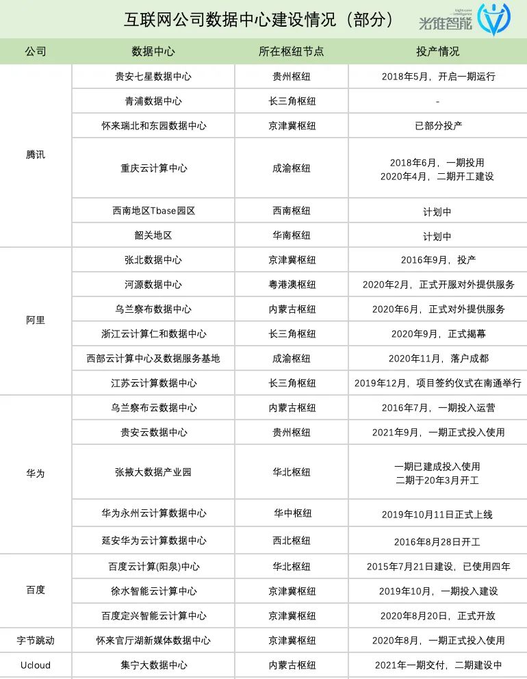 5、百度:阳泉+京津冀一直以人工智能为重要战略的百度,也不断在数据中心的底层建设上进行布局。早在2015年7月21日,百度便在山西省阳泉市建设百度云计算(阳泉)中心,依靠太阳能光伏发电,是我国太阳能光伏发电的首例应用。该中心数据存储量超过4000PB,可存储的信息量相当于20多万个中国国家图书馆的藏书总量;同时由于使用了百度自主研发的的高性能、低功耗服务器,数据中心CPU总量高达70万颗、CPU内核总数超过300万个。随着百度智能化的发展,其自建数据中心的步伐也在加快。2019年10月,百度在保定,同时自建两个超大型云计算中心,分别为徐水智能云计算中心和百度定兴智能云计算中心。2020年8月20日,百度在保定自建的超大型数据中心宣布开放,承载36万台AI服务器。不过,最近两年,百度还暂未透露新的数据中心建设。