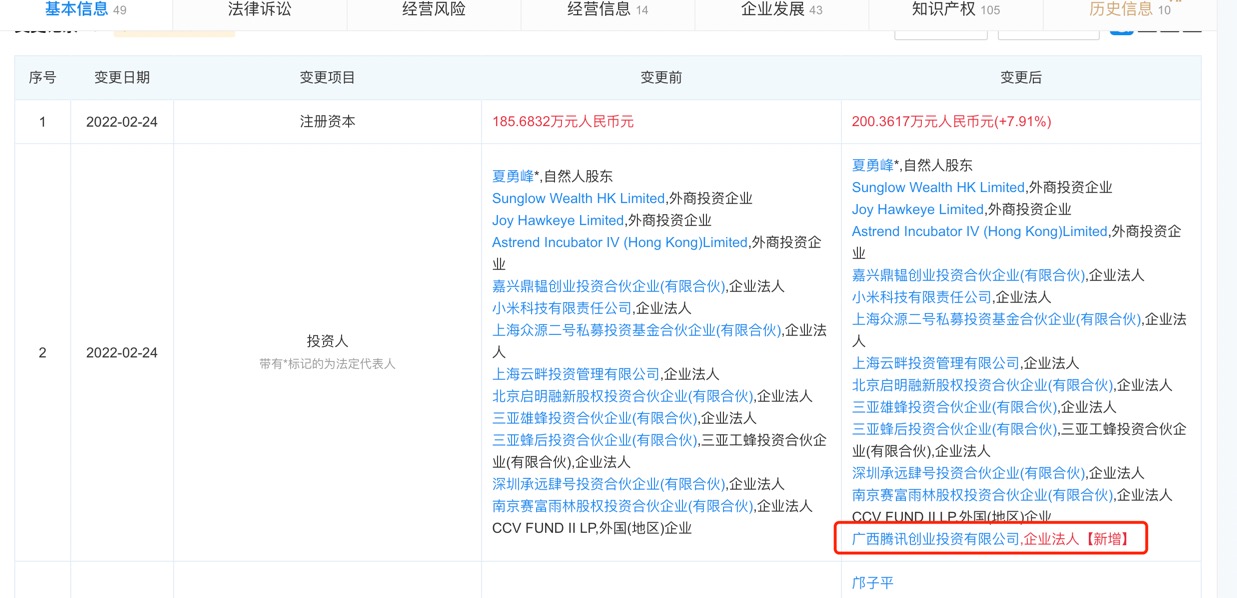 3月2日讯,企查查显示,北京蜂巢世纪科技有限公司于2月24日发生工商信息变更,新增股东广西腾讯创业投资合伙企业。相关页面显示,腾讯认缴了14.6785万元人民币,持股7.326%。