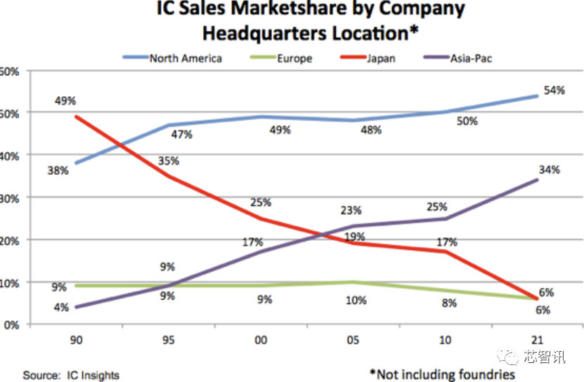 另外IC Insights还展示了北美、欧洲、日本、亚太地区自1990年以来芯片市场份额的变化曲线。