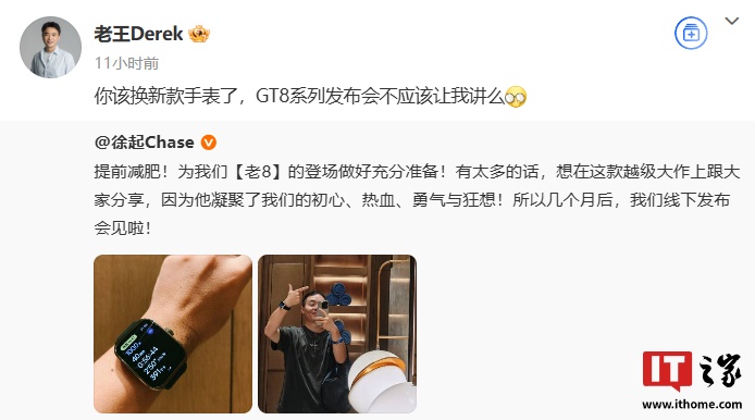 目前关于这款手表新品,真我官方暂未透露更多信息,但结合 realme 副总裁王伟与真我 realme 副总裁、全球营销总裁、中国区总裁徐起的互动来看,预计其将在真我 GT8 手机发布会上正式亮相。