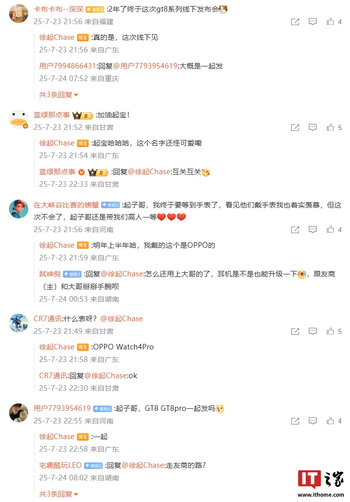 IT之家从徐起与网友的互动了解到,真我近期还将发布真我 15 系列新机,同时 GT8 系列将回归线下发布会的形式,并在几个月之后举行(具体时间未公布)。