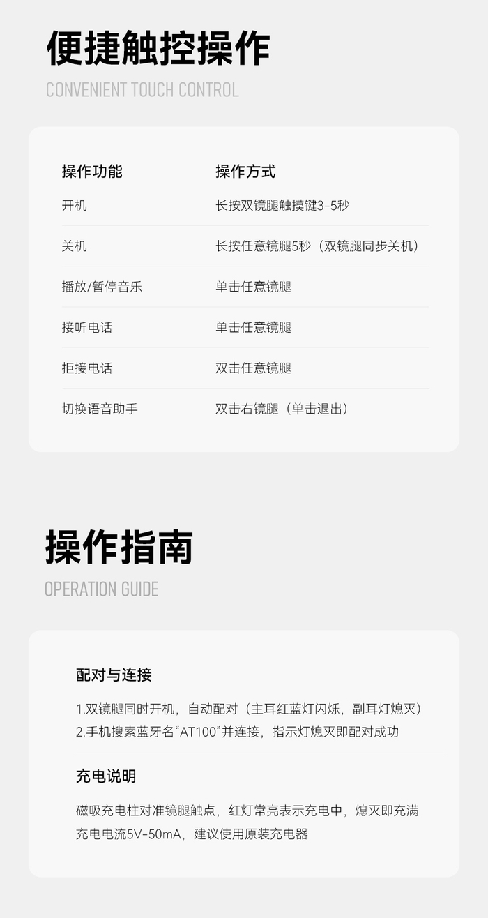 1.双镜腿同时开机,自动配对(主耳红蓝灯闪烁,副耳灯熄灭)