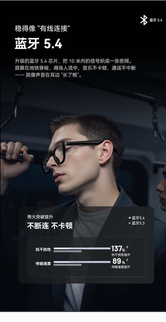 升级的蓝牙 5.4 芯片,把 10 米内的信号织成一张密网。就算在地铁穿梭、商场人流中,音乐不卡顿,通话不中断 —— 就像声音在耳边 "长了根"。