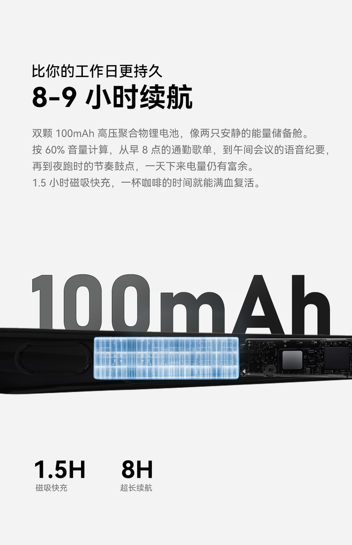 双颗 100mAh 高压聚合物锂电池,像两只安静的能量储备舱。按 60% 音量计算,从早 8 点的通勤歌单,到午间会议的语音纪要,再到夜跑时的节奏鼓点,一天下来电量仍有富余。1.5 小时磁吸快充,一杯咖啡的时间就能满血复活。