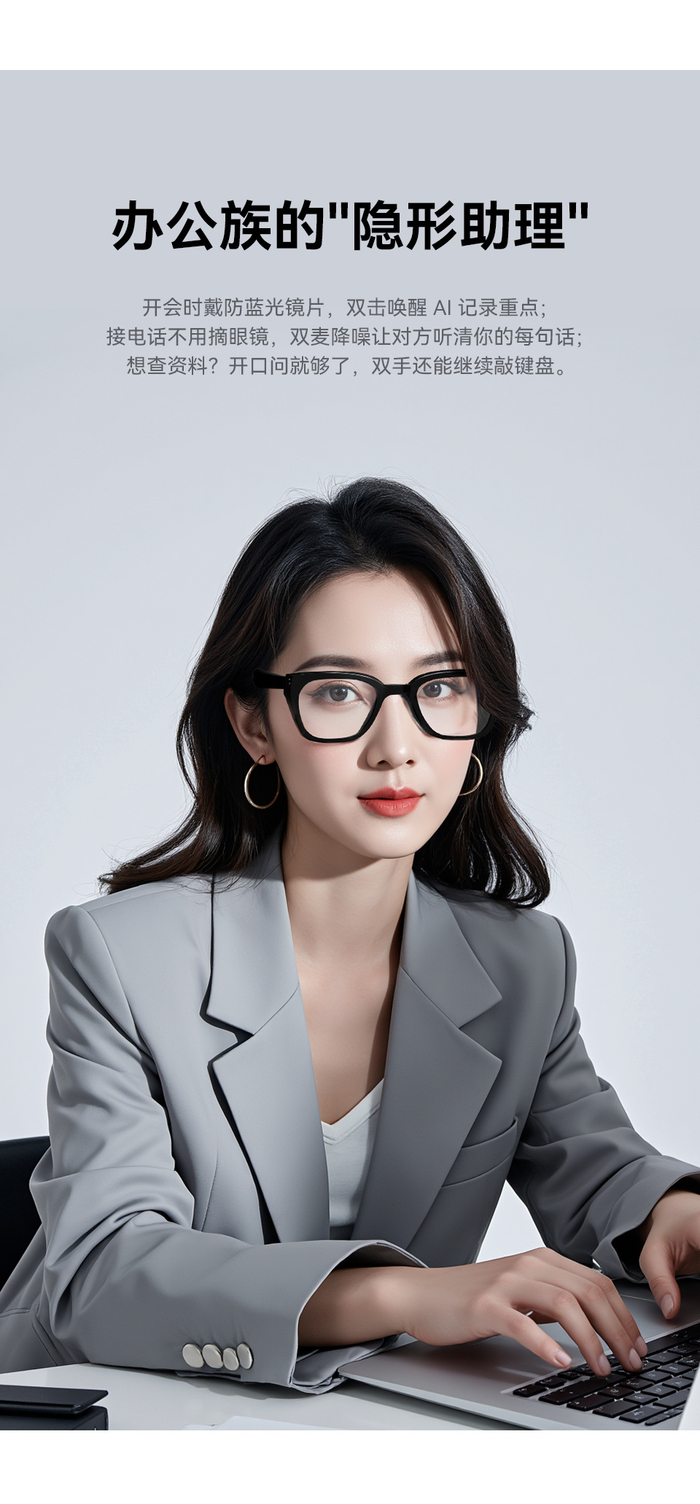 开会时戴防蓝光镜片,双击唤醒 AI 记录重点;接电话不用摘眼镜,双麦降噪让对方听清你的每句话;想查资料?开口问就够了,双手还能继续敲键盘。