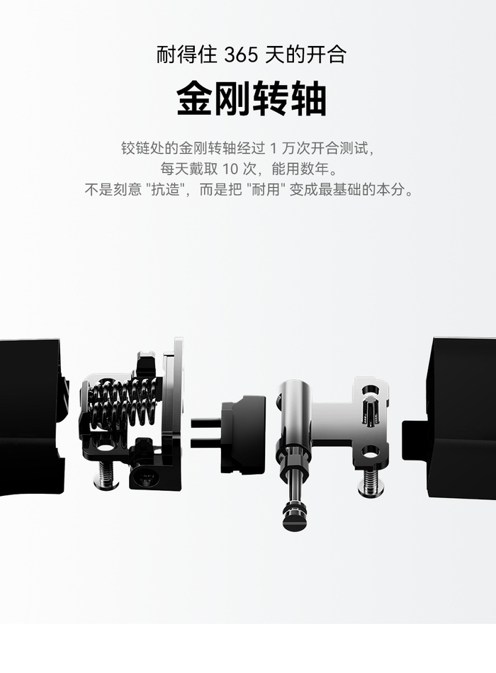 铰链处的金刚转轴经过 1 万次开合测试,每天戴取 10 次,能用数年。不是刻意 "抗造",而是把 "耐用" 变成最基础的本分。