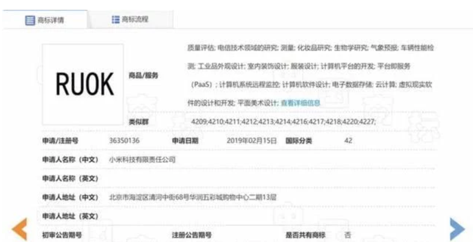 值得一提是,小米已经将“RUOK”申请了注册商标,申请注册号为36350136,申请日期2019年02月15日,属于商品/服务。目前状态:等待实质审查。