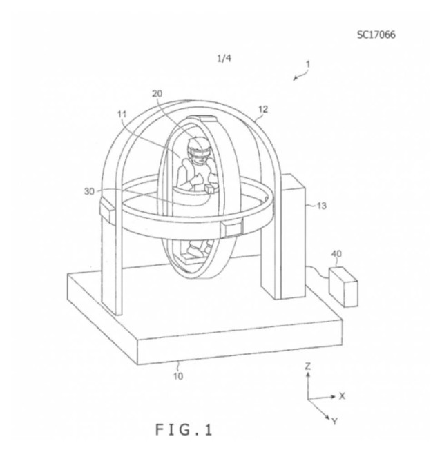 从专利示意图给出的备注来看,体验者被包裹在两个重叠但可以随意转动的圆环之内,序号“10”代表姿态控制单元,“11”为座位,“12”为使用者,“13”为驱动装置,“20”为VR眼镜显示设备,“30”为相机,“40”为信息处理设备。