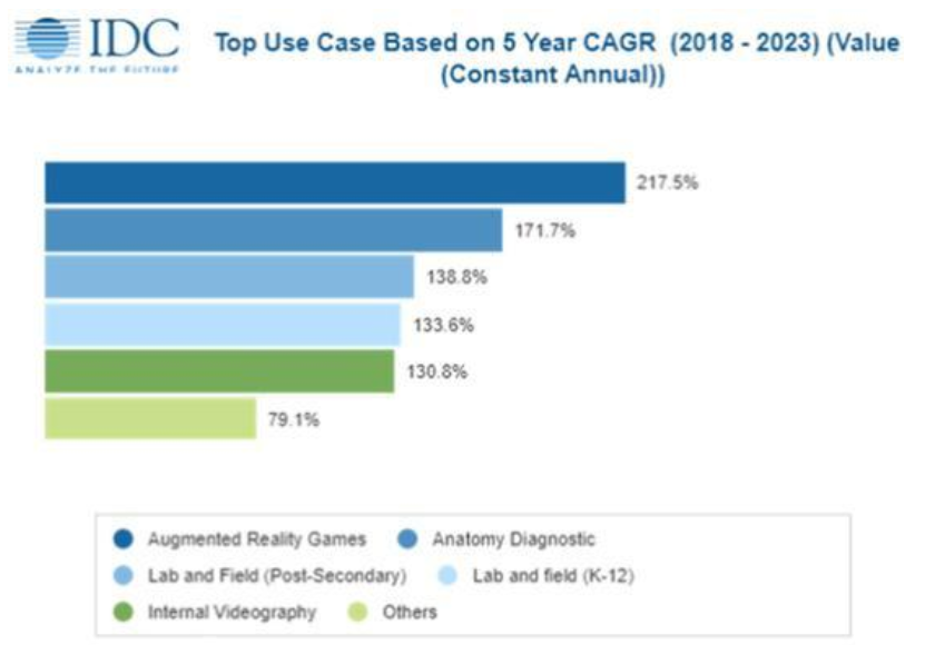 虽然去年商业领域的支出超过了消费者支出,并将在预测期间继续占据主导地位,但虚拟现实游戏是最主要的用例,2019年将占据AR/VR总支出的19.3%左右,其次是培训和360度教育视频观看。然而,就复合年增长率而言(2018-23),增强现实游戏、解剖诊断、实验室和现场(大专以上)是增长最快的用例。