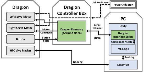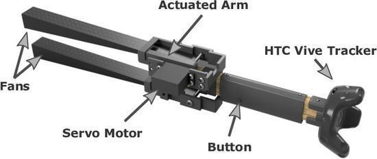 从那时起,这个项目就演变成了在VR控制器上进行拖拽。工程师们并没有使用前后移动的内部重量,而是改用了一个控制器,该控制器使用3D打印部件组合、一个激活控制器的按钮、一个HTC VIVE跟踪器、两个用于驱动的MG996R伺服电机和两个可打开的半大型折叠扇子。可在570ms内打开高达650%实际尺寸的区域,以产生阻力。