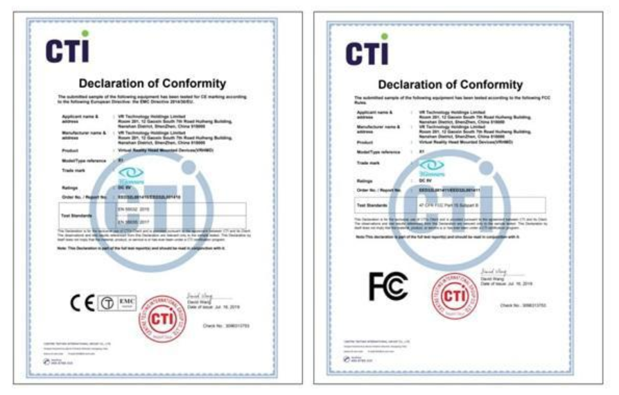 面向家庭娱乐影音以及个人消费娱乐,3Glasses于2019年4月10日推出了全新一代消费级超薄VR眼镜3Glasses X1。而这款X1瞄准的也不仅仅是中国市场,根据3Glasses公布的两份文件,3Glasses X1已经通过了美国FCC和欧盟CE认证,为登陆欧美市场开路。