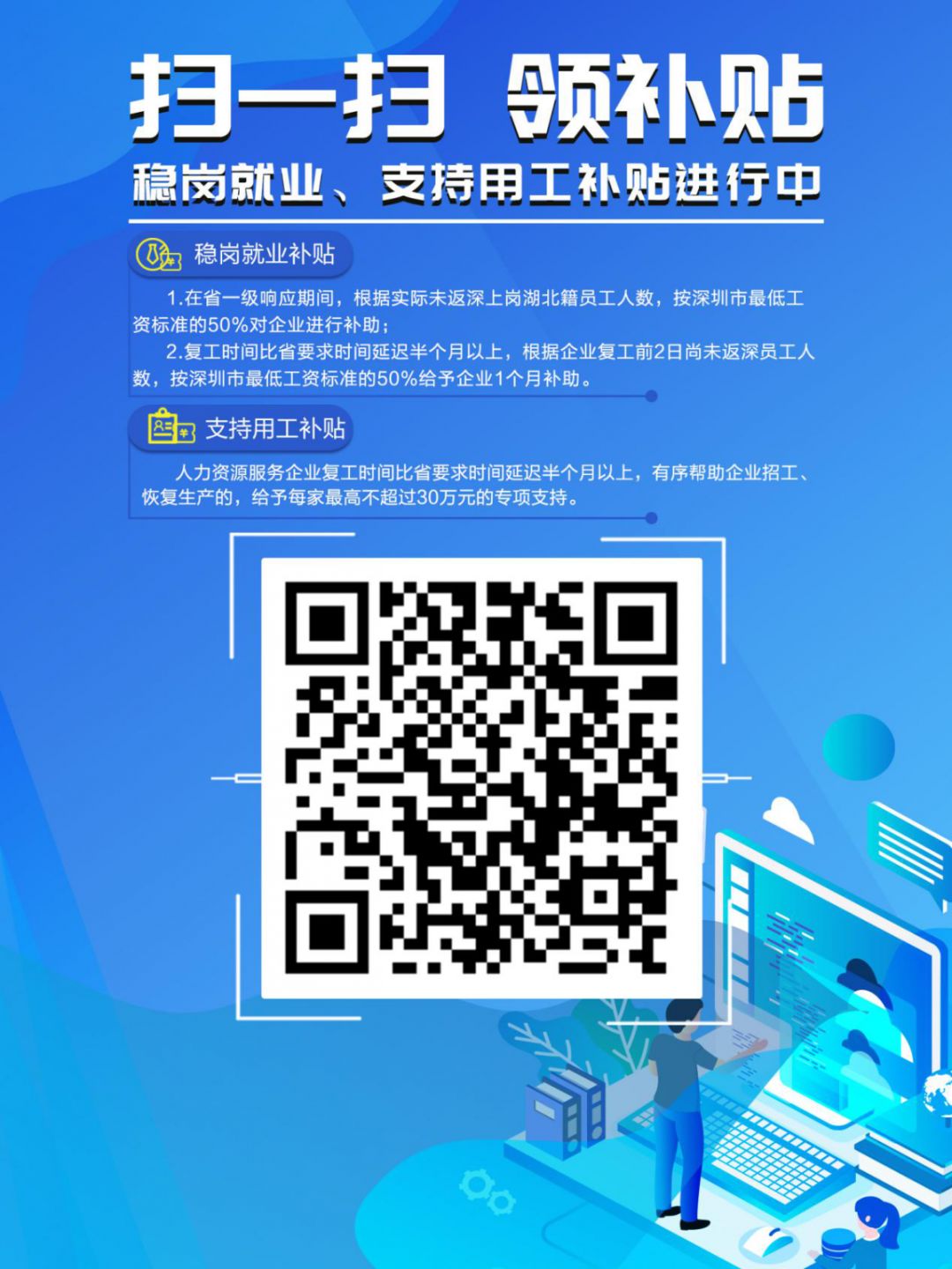 中小企业稳岗就业补贴:湖北籍员工受疫情影响未返深上岗、且企业继续按国家有关规定支付员工工资的,在广东省一级响应期间,按深圳市最低工资标准的50%对企业进行补助;复工时间比广东省要求时间延迟半个月以上、且企业继续按国家有关规定支付员工工资的,根据企业复工前2日尚未返深员工人数,按深圳市最低工资标准的50%给予企业1个月补助。