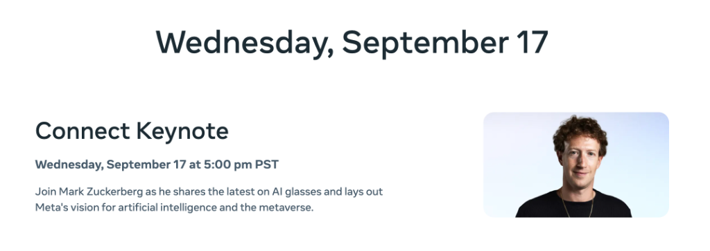 Meta最新公布的Connect大会日程显示,公司首席执行官扎克伯格将于北京时间9月18日发表主题演讲,分享“AI智能眼镜的最新进展”。这主题预示着一场重要的硬件与软件发布活动即将到来,将市场的目光牢牢锁定在Meta的下一代可穿戴设备上。