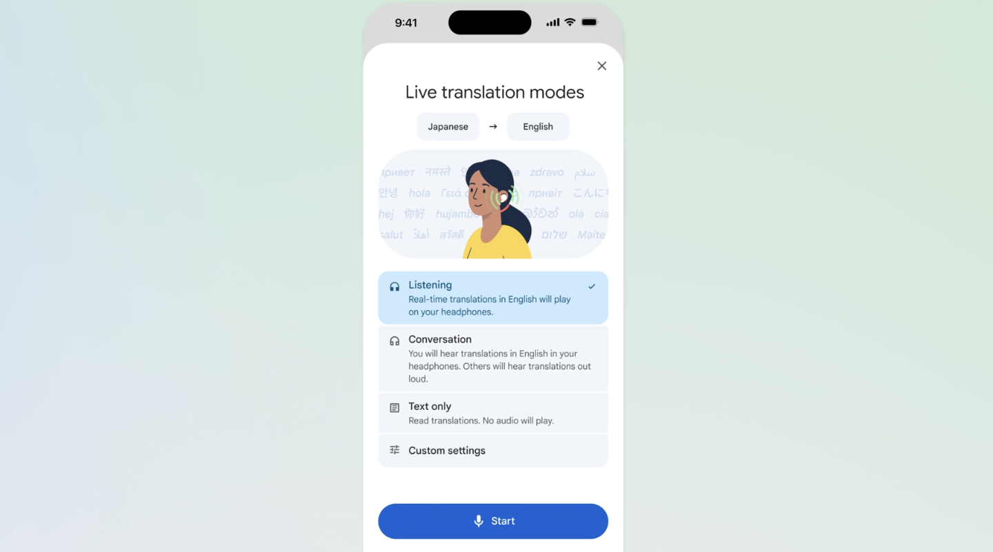 该功能最早于去年以测试版形式推出,此次不仅覆盖 iOS,也进一步扩展至更多国家和地区市场,用户只需在应用中进入“实时翻译(Live translate)”模式,并选择“倾听(Listening)”,即可通过耳机实时接收翻译内容。