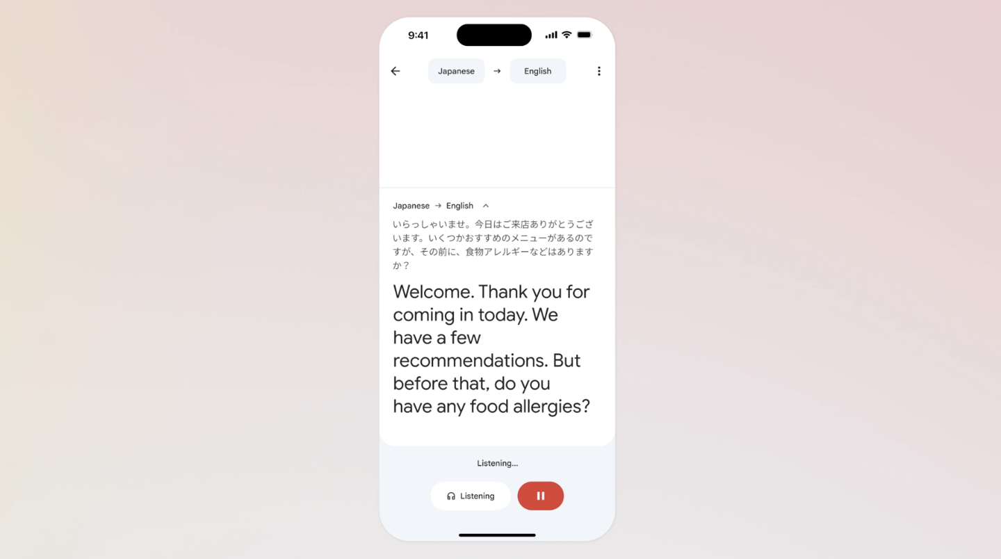 谷歌表示,该功能可适用于跨语言家庭交流、出境旅行等各种场景,支持全球超过 70 种语言,包括英语、中文、日语、韩语、法语、德语、西班牙语等。其不仅能进行语义翻译,还会尽可能保留说话者的语气、重音和节奏,从而提升对话的自然度,并帮助用户区分不同发言者。