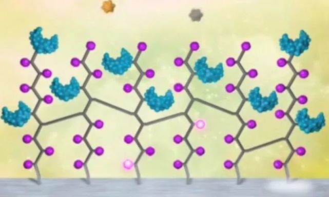 有线酶技术”的原理,葡萄糖分子与氧化酶接触后,产生的电信号可由聚合物链式传到至电极上(图片来自公开的会议报告)
