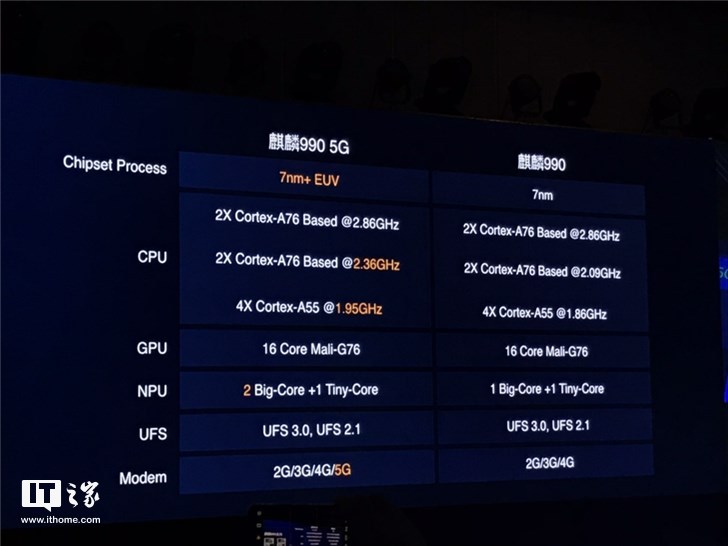麒麟990系列分为两个型号,分别是集成5G基带的麒麟990 5G以及没有集成5G基带的版本麒麟990。规格方面,麒麟990工艺升级到了7nm+ EUV,规模方面有所提升。