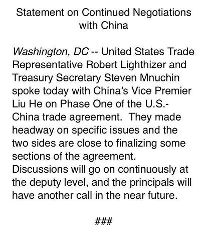 新华社北京10月26日电 10月25日晚,中共中央政治局委员、国务院副总理、中美全面经济对话中方牵头人刘鹤应约与美国贸易代表莱特希泽、财政部长姆努钦通话。双方同意妥善解决各自核心关切,确认部分文本的技术性磋商基本完成。双方确认就美方进口中国自产熟制禽肉、鲶鱼产品监管体系等效以及中方解除美国禽肉对华出口禁令、应用肉类产品公共卫生信息系统等达成共识。双方牵头人将于近期再次通话,在此期间工作层将持续抓紧磋商。