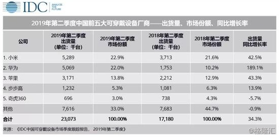 2019年9月,IDC发布了《2019年Q2中国可穿戴设备市场季度跟踪报告》,根据报告,第二季度中国可穿戴设备市场出货量为2307万台,同比增长 34.3%。其中,基础可穿戴设备(不支持第三方应用的可穿戴设备)出货量为1846万台,同比增长31.9%,智能可穿戴设备出货量为461万台,同比增长45.0%。