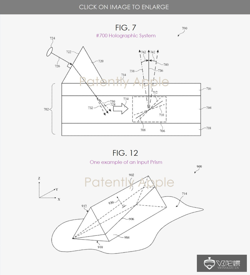 苹果的专利图7是说明性输入棱镜和说明性偏光镜的侧视图,该说明性偏光镜具有偏斜轴随光栅大小而变化的光栅。图12是具有不同色散特性的不同区域的说明性输入棱镜的侧视图。