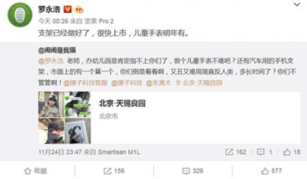 在微博上,罗永浩转载了网友的微博,并表示:支架已经做好了,很快上市,儿童手表明年有。罗永浩之前曾多次表示做手机不赚钱,配件才赚钱。相信这次锤子研发儿童手表也不仅仅是为了赚钱,同时也是为了儿童的安全性尽到自己的力量。