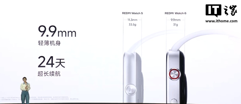 REDMI Watch 6 标称续航可达 24 天,厚度 9.9mm,搭载小米澎湃 OS 3,可更换多彩表盘、回复微信、碰一碰支付,并新增了多项小米生态互联功能。