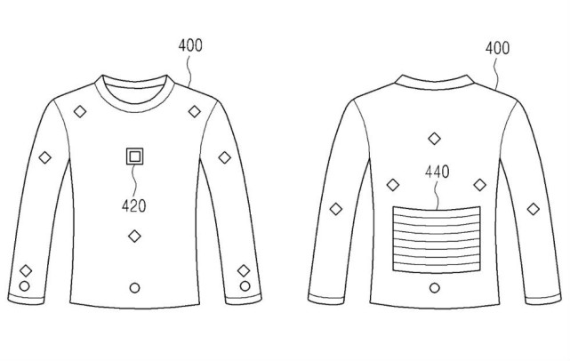 三星在专利中介绍说,技术用到了处理器、传感器及其它硬件,组成一套系统。从图片看,T恤下背部分有一些硬件,前面有一个处理单元,还有其它一些没有标记的部分。衣服有什么用呢?三星介绍说:“该发明是一种穿戴电子设备,它用能量收集器发电,激活传感器,传感器会收集数据,系统根据数据确定用户的活动。”