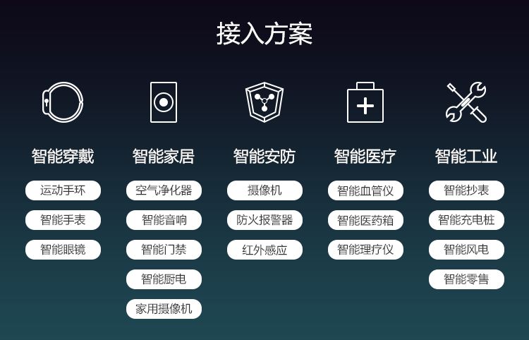 当前主要集中在智能穿戴、智能家居、智能安防、智能医疗、智能工业等几大了领域。接入方案基本上涵盖了当前主流物联网类产品,针对云端、APP端、设备端都提出了不同的解决方案,能实现远程诊断、设备定位、告警服务、物联支付等,同时还能做数据监控。