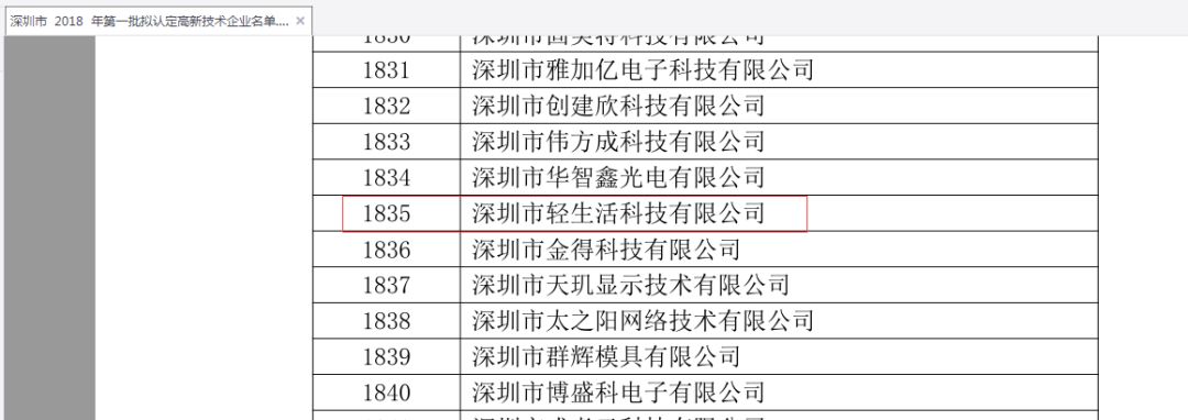 2018年10月16日,全国高新技术企业认定管理工作领导小组办公室公示了深圳市2018年第一批拟认定高新技术企业名单,深圳市轻生活科技有限公司榜上有名,这是继去年12月份荣获深圳市级称号后,不到一年,又一次荣获国家级高新技术称号。成立仅三年,轻生活科技已国、市两大高新企业资质在手。