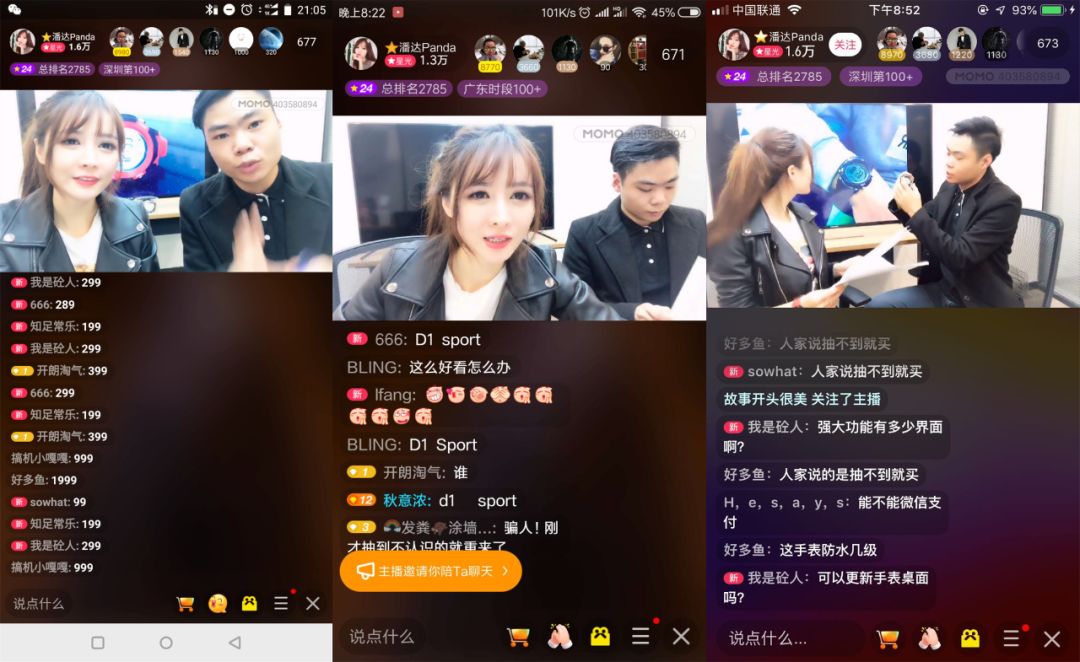 1月8日晚上8点,D1 Sport线上发布会正式开始,在陌陌、今日头条、微博三大平台同步直播,同时覆盖微信群、QQ群等上万人的社群。这次直播发布会还邀请了陌陌时尚潮酷女主播潘达一起来见证。