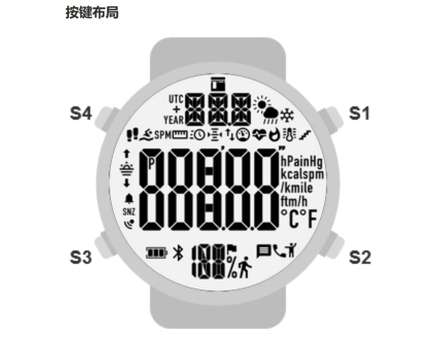 D1 Sport智能功能的切换与设置由四个按键来实现。S4是开/关机键,同时控制手表背光;S2为暂停与启动键;S3是模式切换按键,S1为状态切换按键。手表上共有时间模式、计步模式、睡眠模式等七大模式,每个模式下都可以切换不同状态。