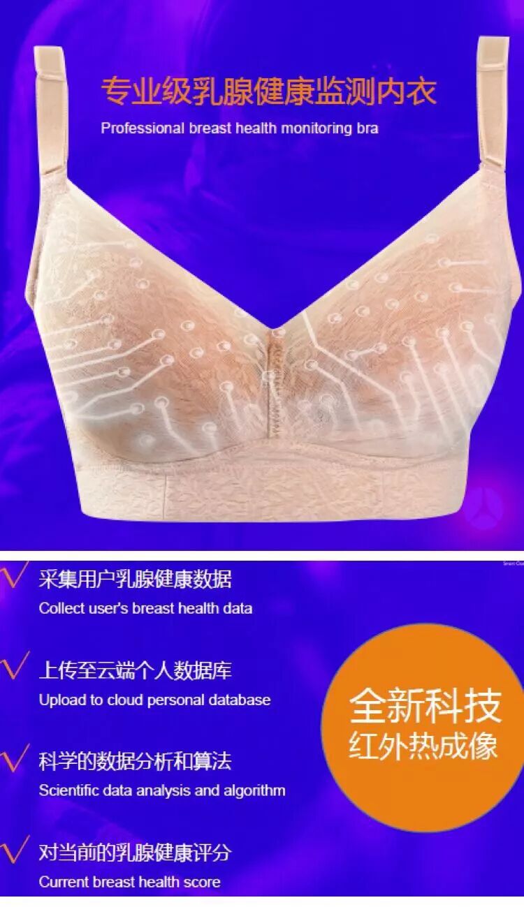此次全球首发的AI智能乳腺健康监测内衣,运用经数十年临床验证的红外成像技术,通过16个专业医疗级高精度温度传感器监测乳房大数据,连续监测各个点位的温度异常,感应精准至0.01°C,通过上亿份女性乳房大数据比对,最终输出乳腺病变预警,让女性实时知晓自己的乳房健康,进而提早预防、提早发现、及时治疗,让每一个女性都能享受到智慧健康的生活。